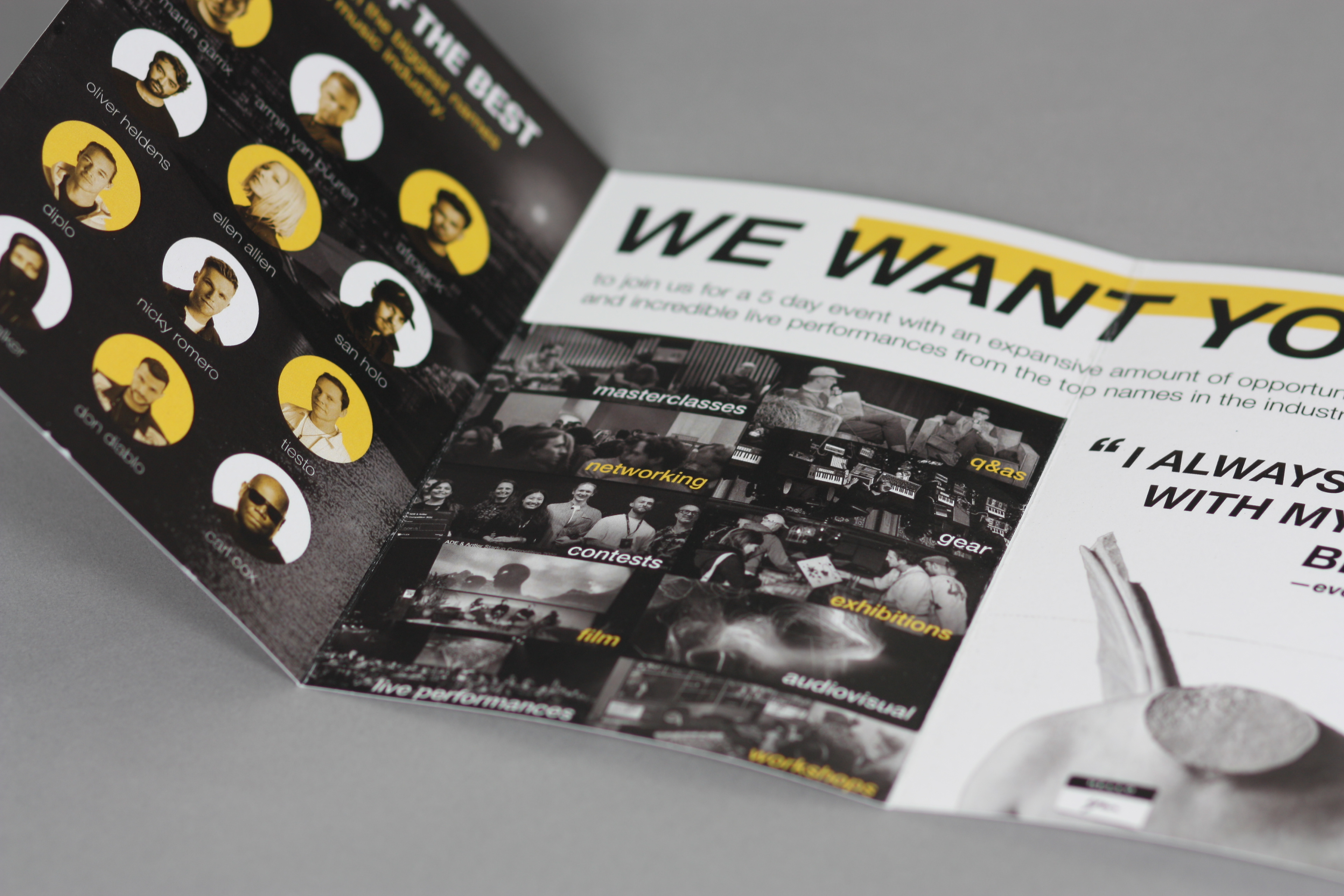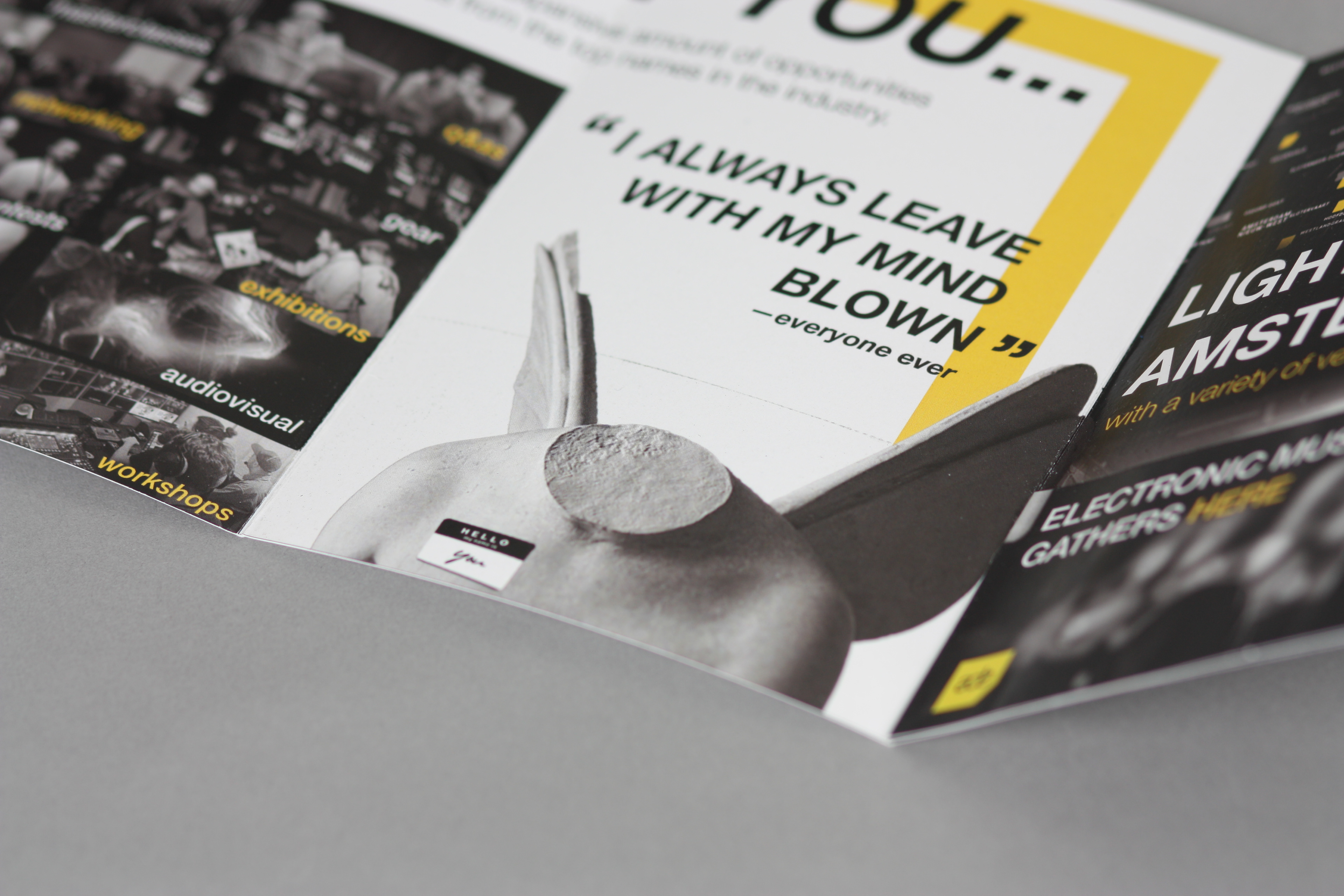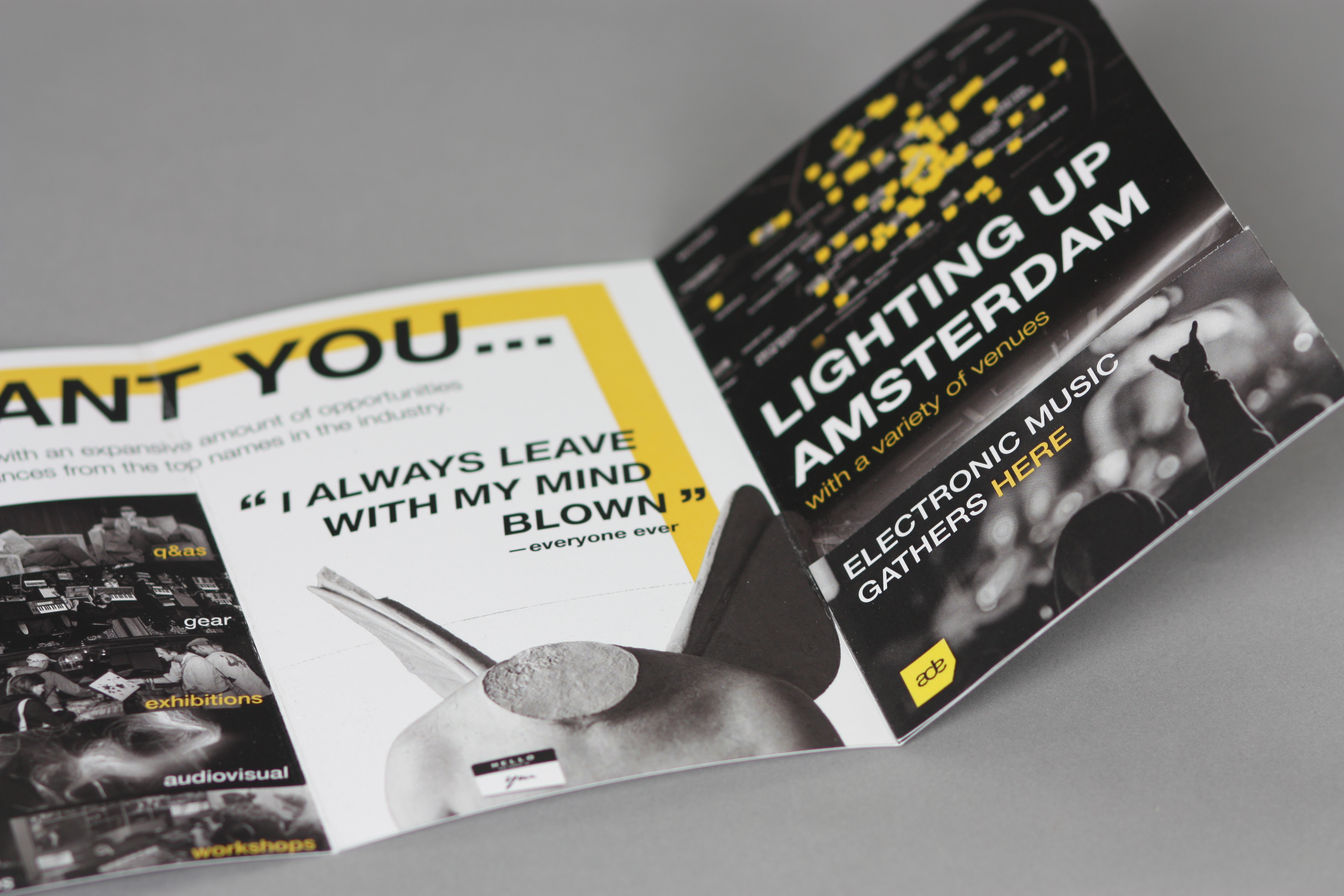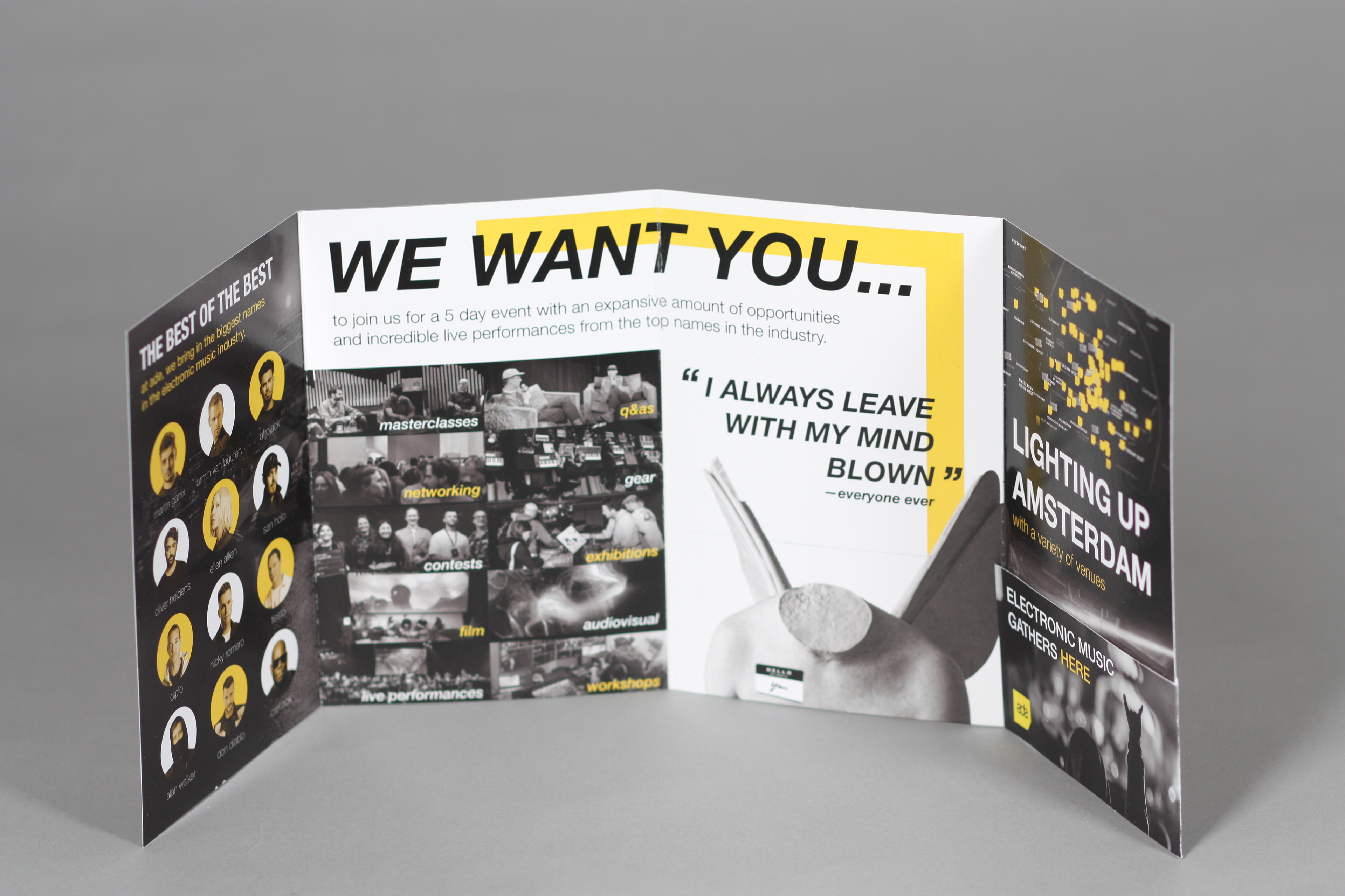 The goal of this project was to create a self-mailer for a pre-existing event that would be sent to potential attendees advertising for the upcoming event. For this project, since I'm into electronic music, I decided to create a mailer for the annual Amsterdam Dance Event, which is a five-day conference and festival held in mid-October.